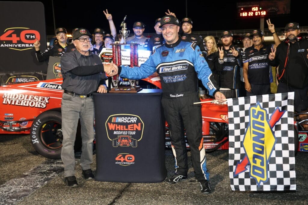 As laps wound down, Patrick Emerling made his case known as he grew ever closer to Johnson’s rear bumper. Emerling pulled up on lap 124 to lead lap 125 and fortunately never had to deal with another caution period. Unspoiled, Patrick Emerling took down the Thompson 150 win in the Big Red Machine look-a-like #1 complete with Geoff Bodine in the 750th NASCAR Whelen Modified Tour victory lane celebration!